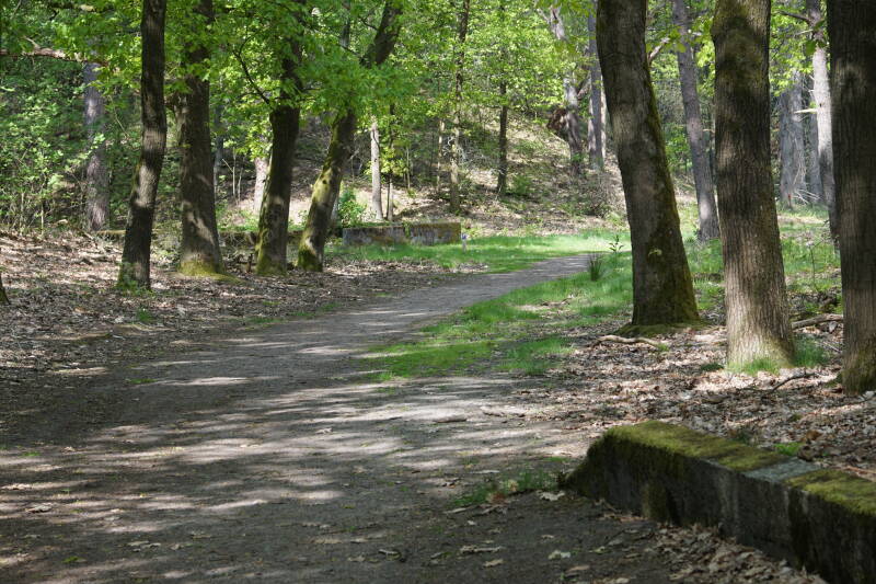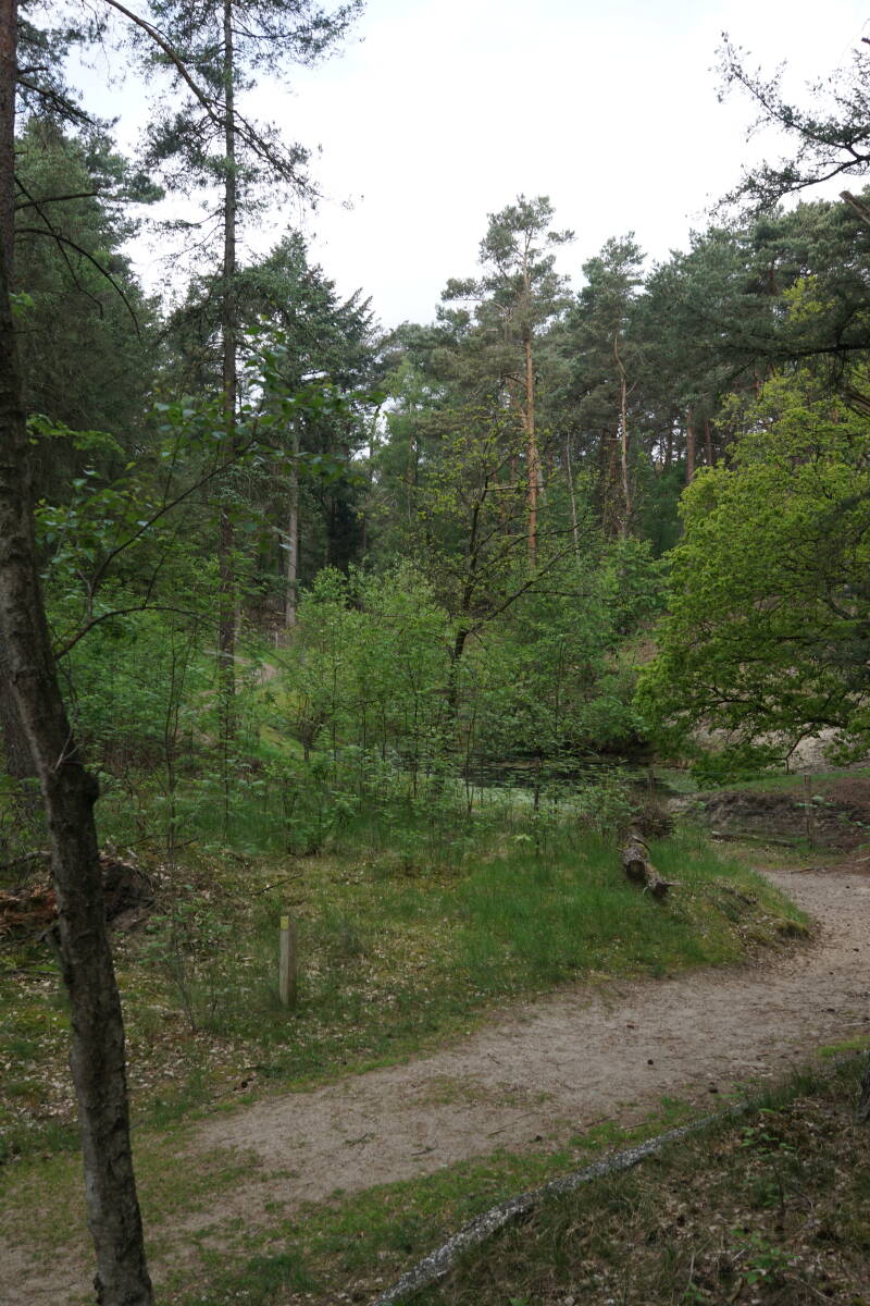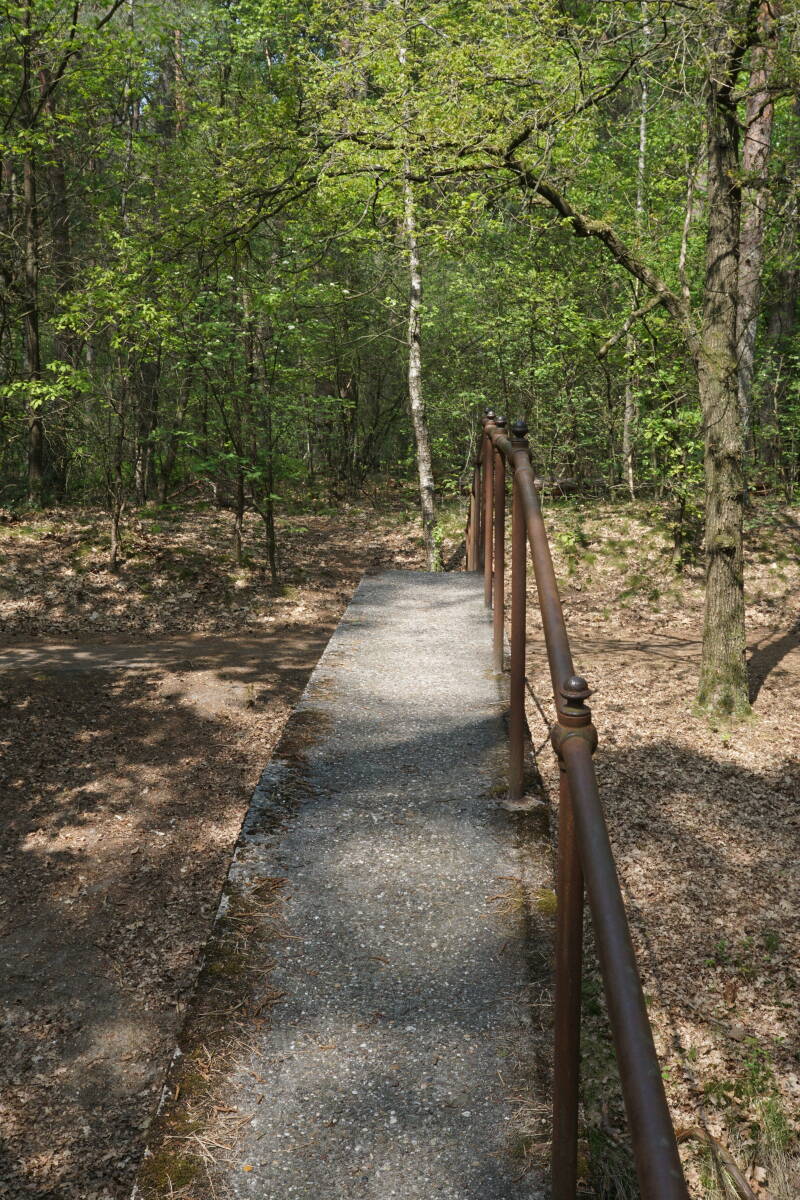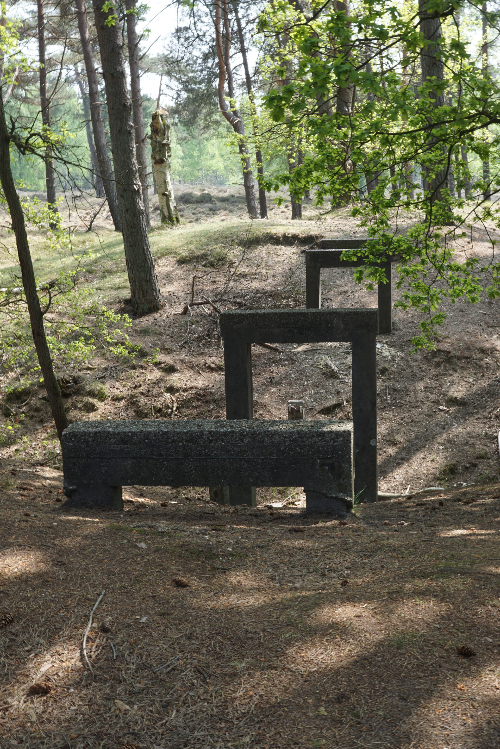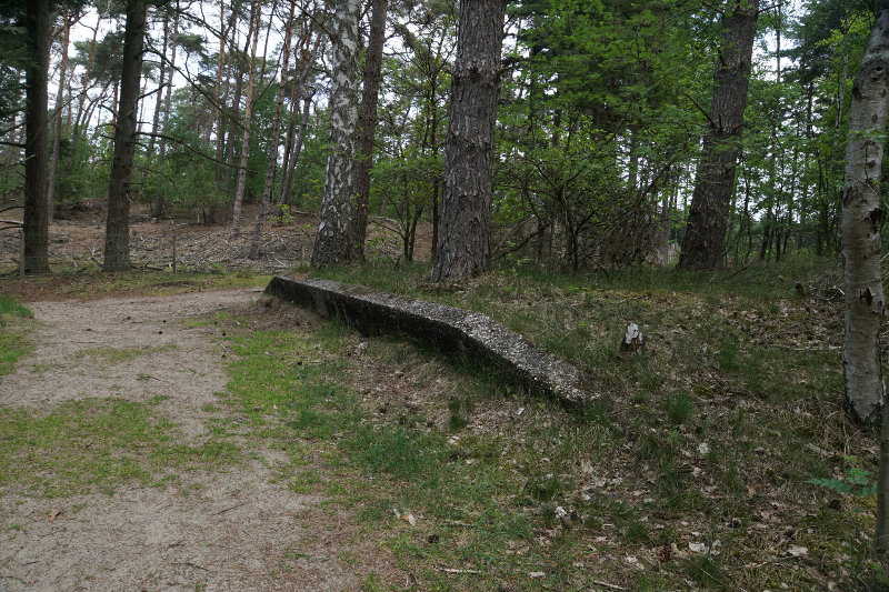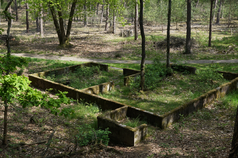 Links de pijlers van een brug voor het smalspoor treintje dat over het terrein liep. Dit werd gebruikt voor het transport van zand maar ook voor plezierritjes naar de heide.